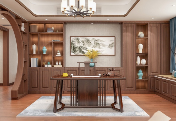 特色工藝品:紫砂茶壺、青花瓷、木雕等工藝品也是新中式裝修的點(diǎn)睛之筆。這些工藝品可以擺放在博古架、茶幾、床頭柜等地方,既具有實(shí)用價(jià)值,又能作為藝術(shù)品展示,為空間增添一份獨(dú)特的東方韻味。