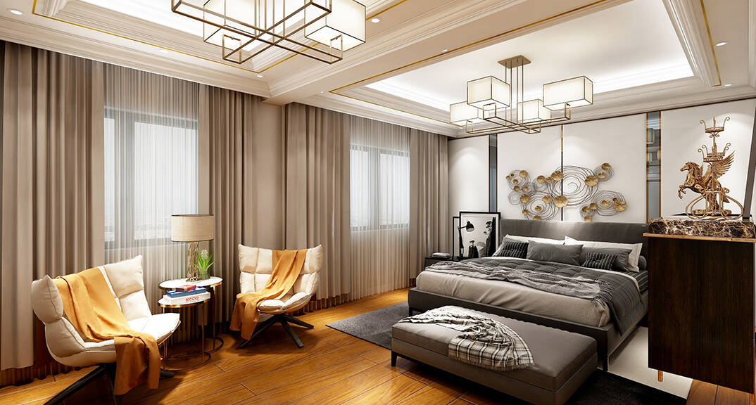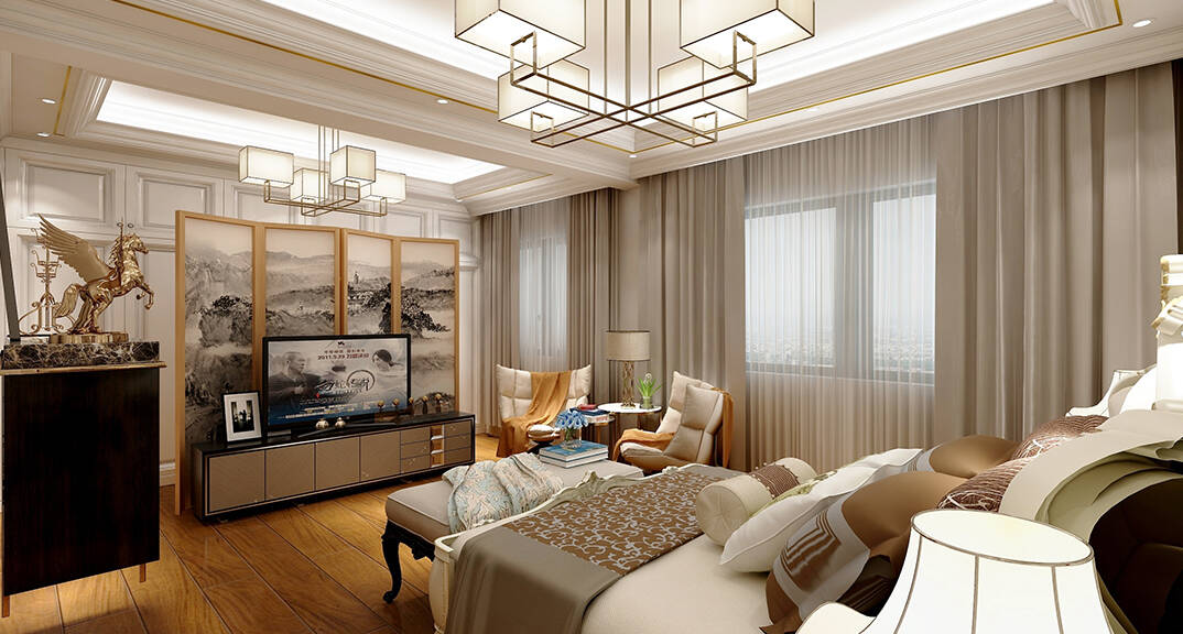 客廳明快鮮明,使用大量的石材以及部分木飾面裝潢使空間顯示出寬闊而富有歷史氣味,臥室布置較為溫馨,作為主人的私密空間,主要以功能性以及實(shí)用舒適為斟酌的重點(diǎn)