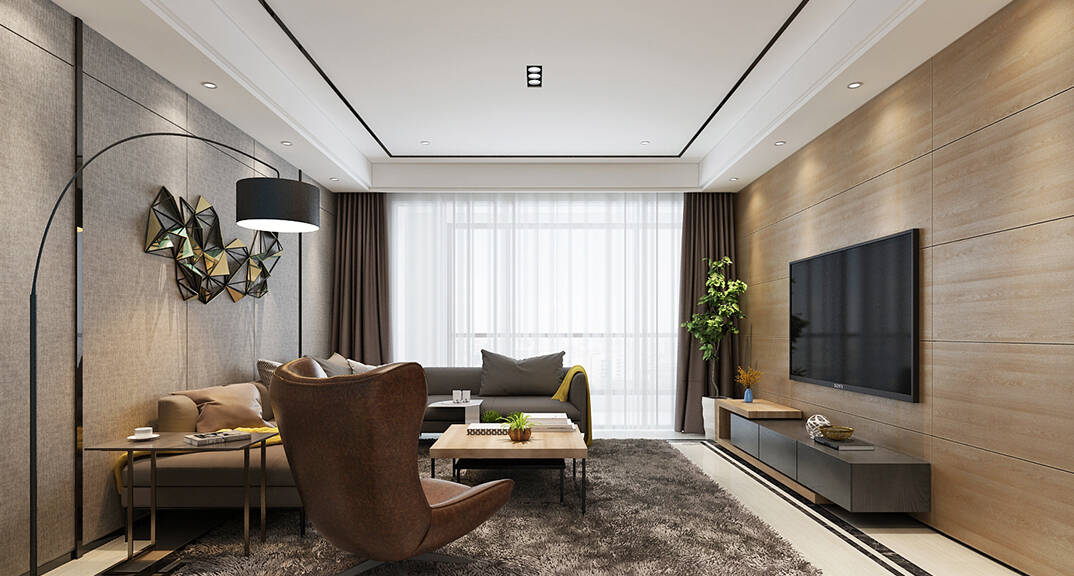 客廳體現(xiàn)了主人的品味,地位,也是交友娛樂的場(chǎng)合,影視墻凹凸線條的護(hù)墻板很好的隱藏了孝親房的門讓整個(gè)空間融為一體。