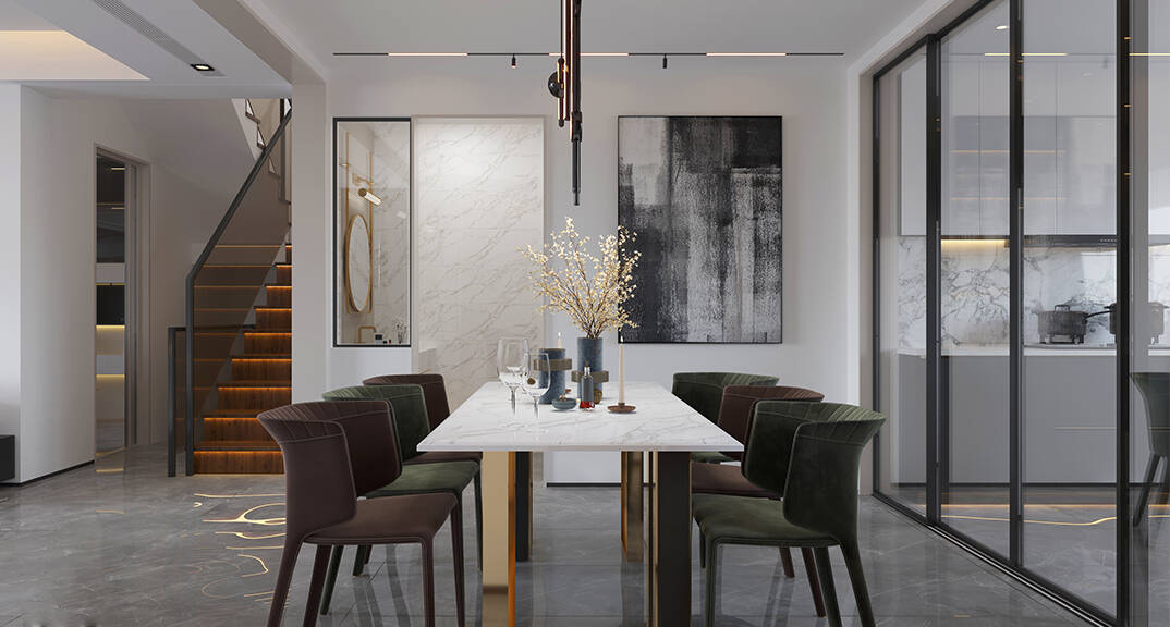 萊頓小鎮(zhèn)·海語墅250㎡別墅下疊一層餐廳現(xiàn)代簡約風(fēng)格裝修案例效果圖