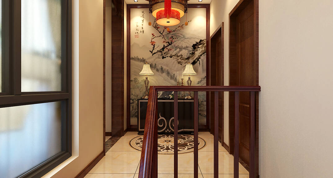 安納溪220㎡獨(dú)棟別墅樓梯走廊古典中式風(fēng)格裝修案例效果圖