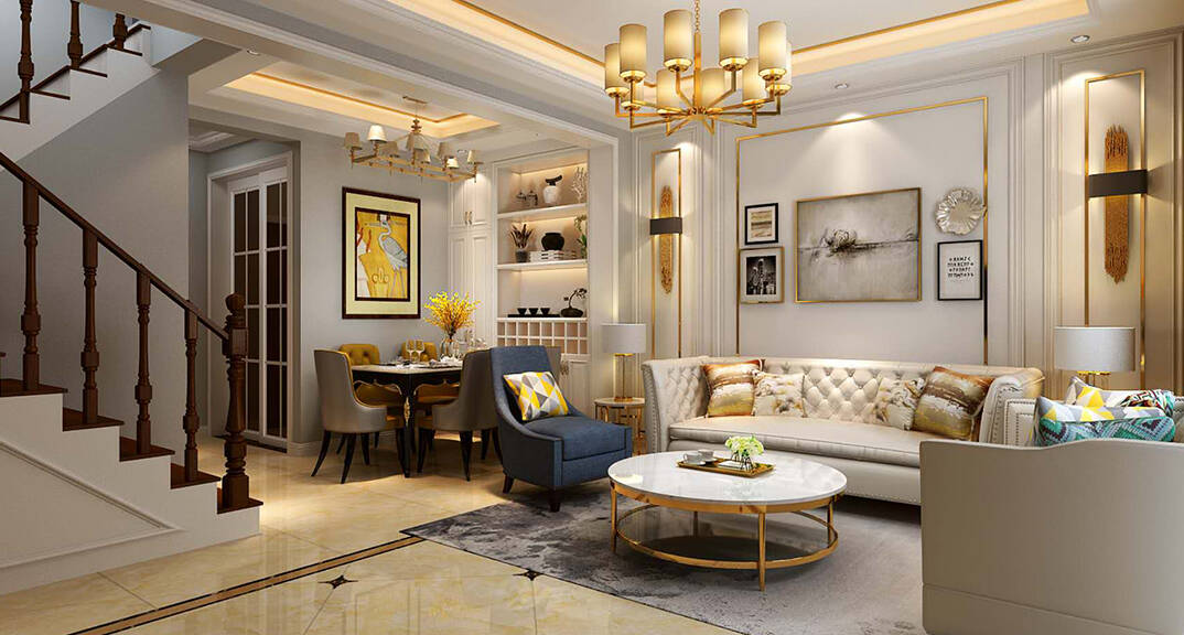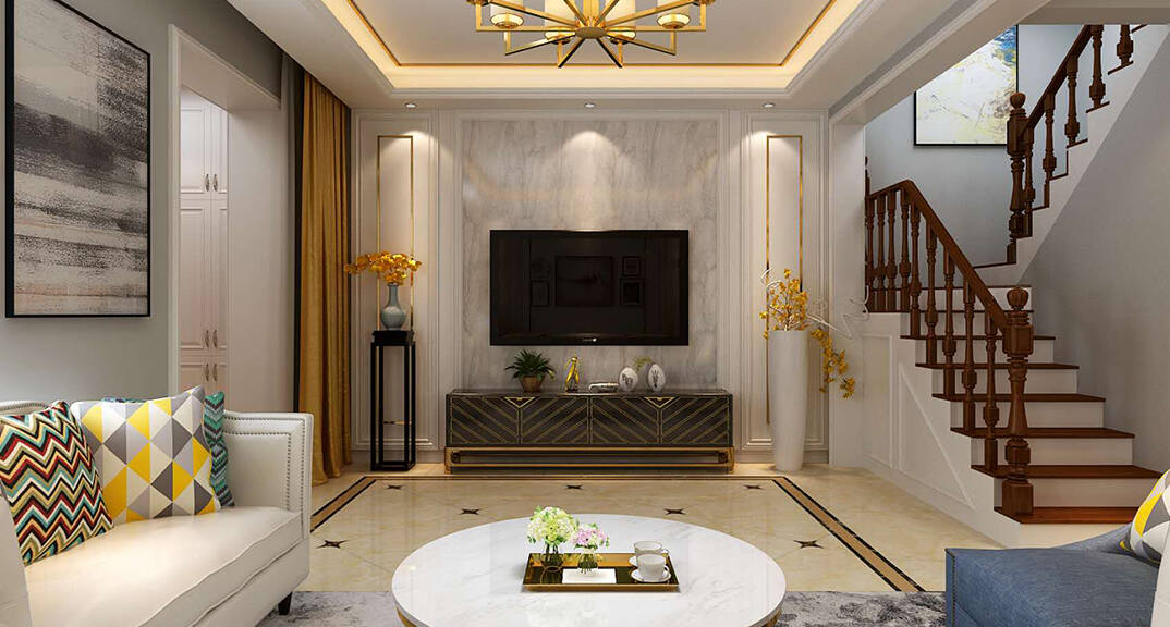 本案為美式風格別墅裝修,以“太陽”為主題元素,采用白色為背景色,藍色、棕紅色為主色,黃色為點綴色,使整個空間如在陽光下照耀著。