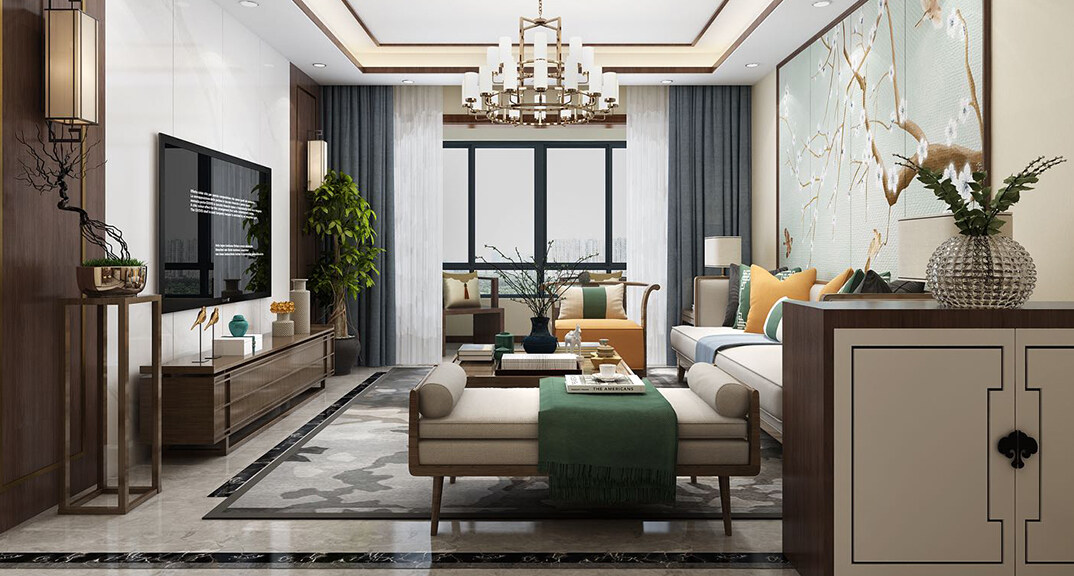 日照港第一生活區(qū)139㎡三室兩廳客廳新中式風(fēng)格裝修案例效果圖