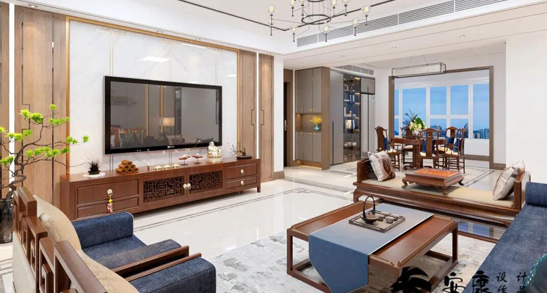 金域?yàn)懲?80㎡四室兩廳客廳電視背景墻新中式風(fēng)格風(fēng)格裝修案例效果圖