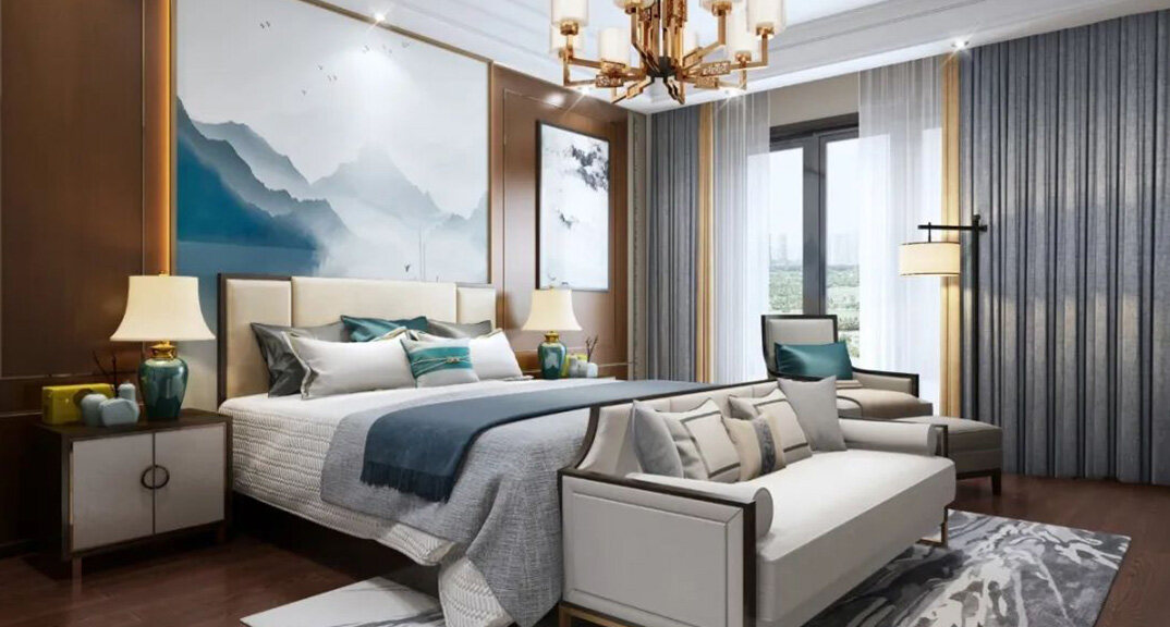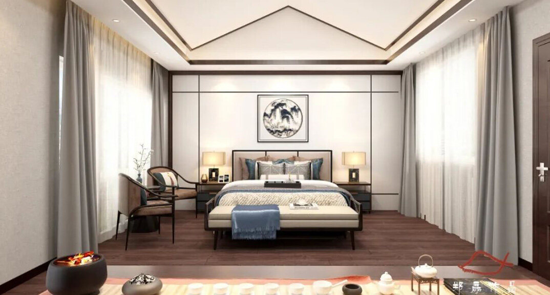 北海錦華352㎡別墅主臥新中式風格裝修案例效果圖