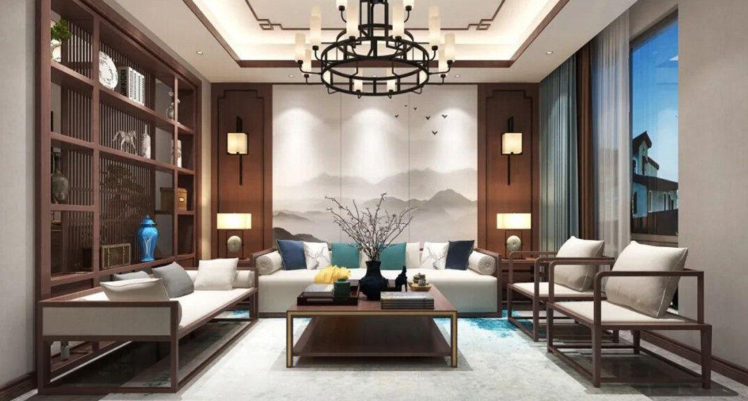 北海錦華352㎡別墅客廳沙發(fā)新中式風格裝修案例效果圖