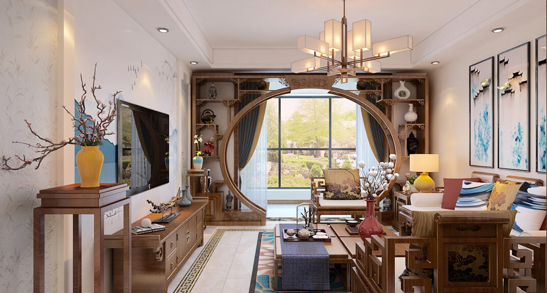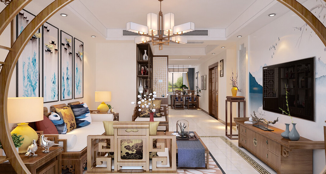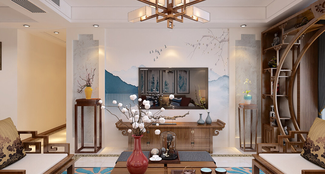 新興中心城125㎡三室兩廳客廳電視新中式風格裝修案例效果圖