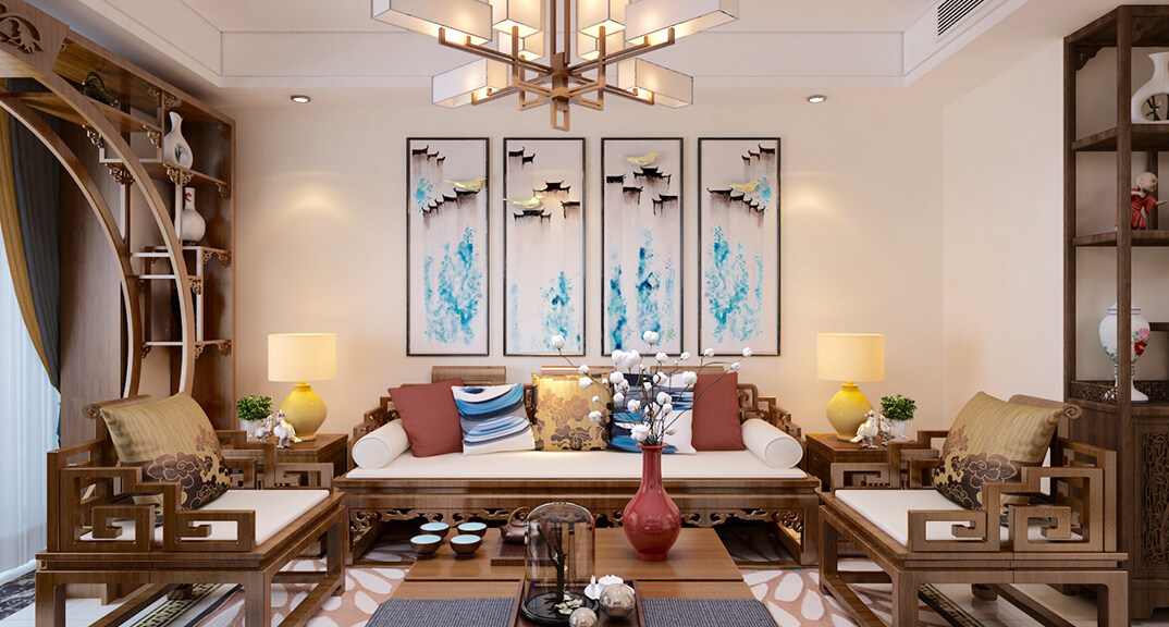 新興中心城125㎡三室兩廳客廳沙發(fā)新中式風格裝修案例效果圖