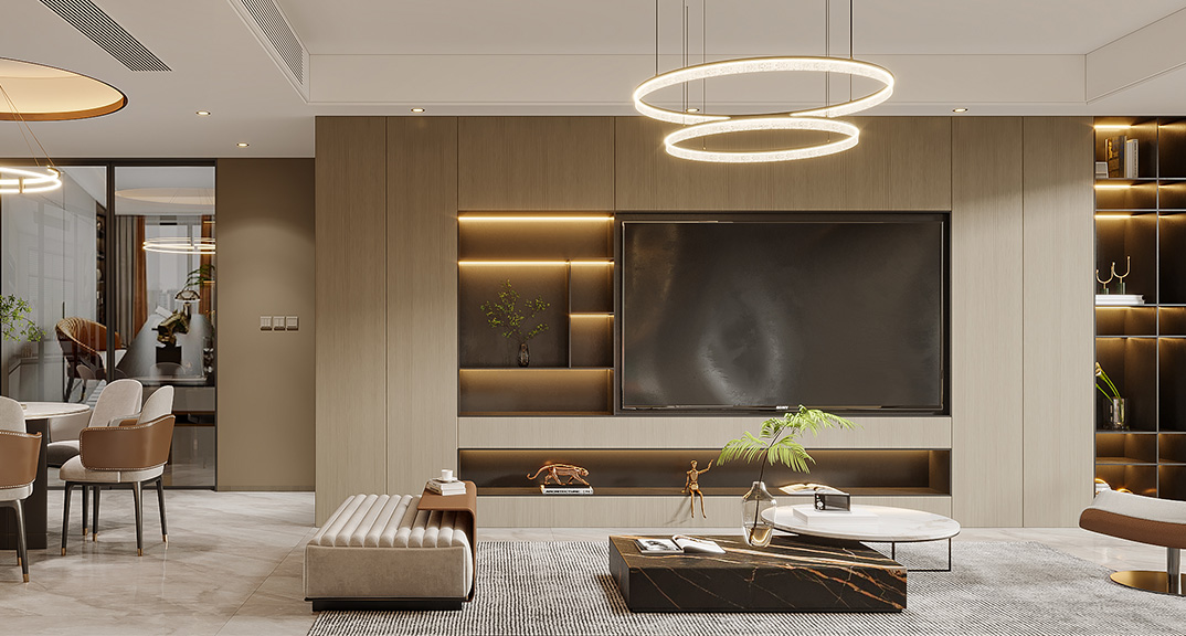 整體淺色為主,適當?shù)脑黾由实膹埩?,客餐廳墻面采用舒適的暖黃色搭配,入戶的鞋帽柜滿足日常使用,由于南次臥的門口影響了電視墻的整體性,在后期材料的選擇和造型的搭配上利用中式風格的對稱特點做電視墻的處理,產(chǎn)生隱形門的效果。也更好的調(diào)和了電視墻的居中視距。