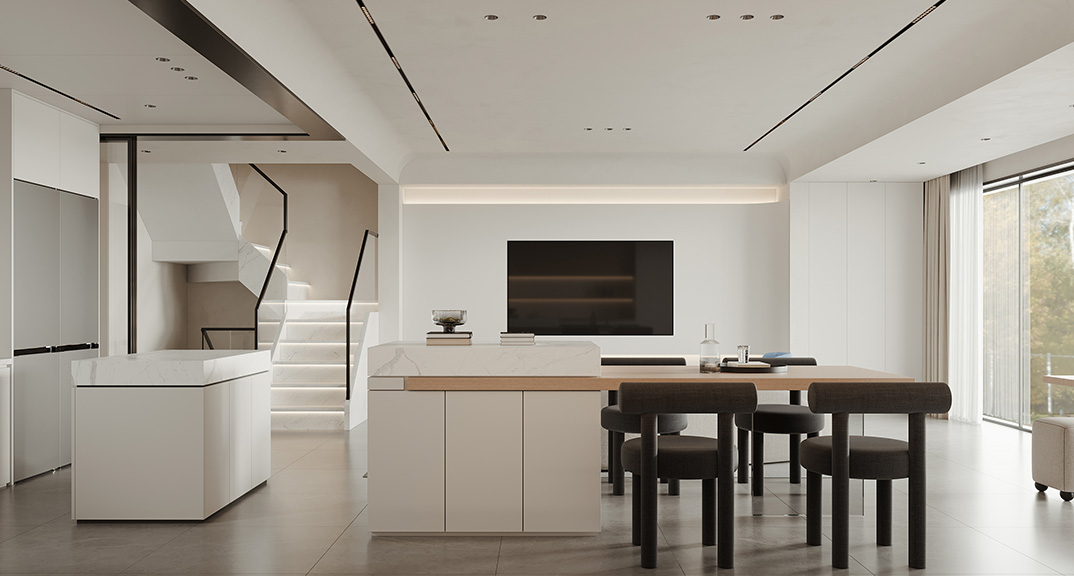 地下室的采光是大家一直很關心的話題,除了利用采光井營造延伸感以外,也可以通過色彩來讓整體空間更加透亮。這套案例我用了奶灰色,材質【灰泥】,摸上去有顆粒感,通過光的漫反射讓整體空間更加柔和溫潤。在木作的選擇上也是選擇墻面的近似色但飽和度更高的原木色,搭配奶白色塊,更加明亮。通過支撐住所并進一步挖掘現有的地下室 , 從而使內部采光打開。 以詩意的方式用各自的顏色代碼表示不同的格調!