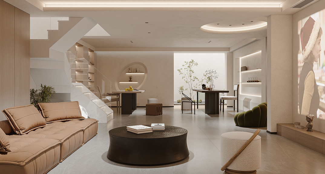 紫荊閣300㎡別墅下疊客廳新中式風格裝修案例效果圖