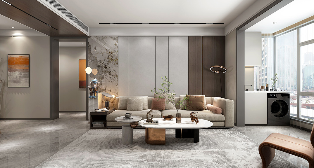 本案設計風格為意式輕奢,拒絕了濃烈的色彩,以一種簡單、純粹的設計語言,回歸生活的本質(zhì),留存給居住者更多生活想象的空間。 整體空間灰橙色、駝色、與淺暖灰色調(diào)展現(xiàn)輕奢低調(diào)的高級質(zhì)感,簡約時尚的家具又增添了一份現(xiàn)代感,重新梳理了空間功能和尺寸,客廳陽臺一體化設計,最大限度引入自然光,高級灰搭配中性色系木飾面,打造一個舒適的高品質(zhì)空間。在空間設計與色彩配搭上,精準地把控節(jié)奏,用設計表達空間的包容性,更多的是通過人性化思考,創(chuàng)造一個功能性完整的舒適生活空間。大塊的木飾面、金屬元素和燈 光的碰撞搭配,凸顯出強大張力,共同打造出意式輕奢腔調(diào)十足的時尚與質(zhì)感。