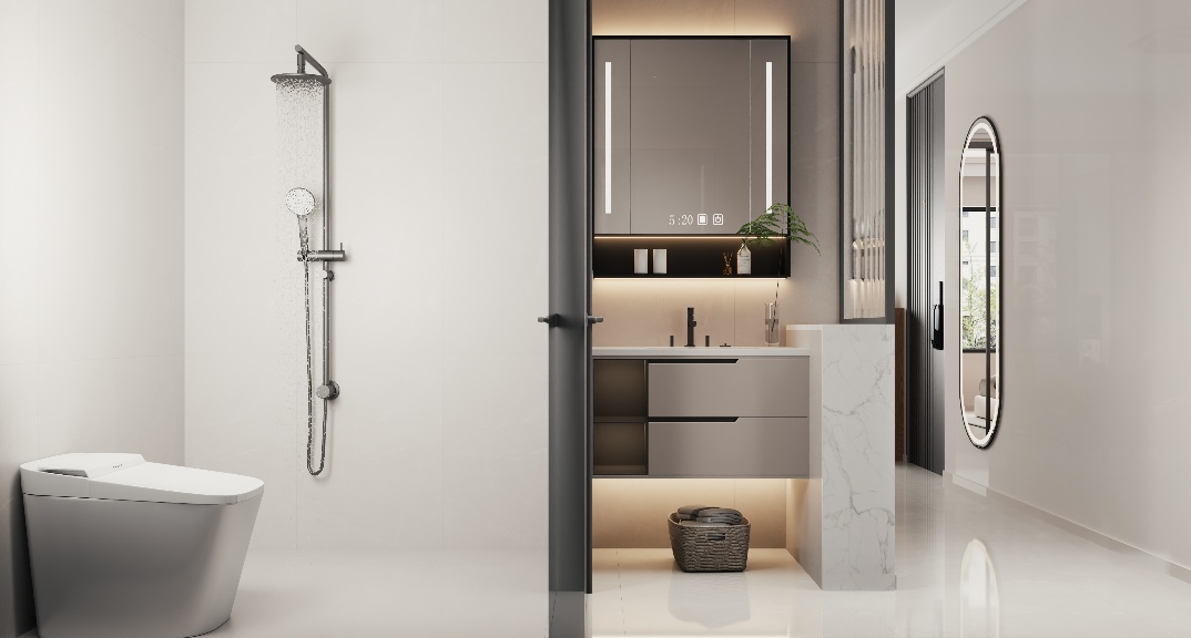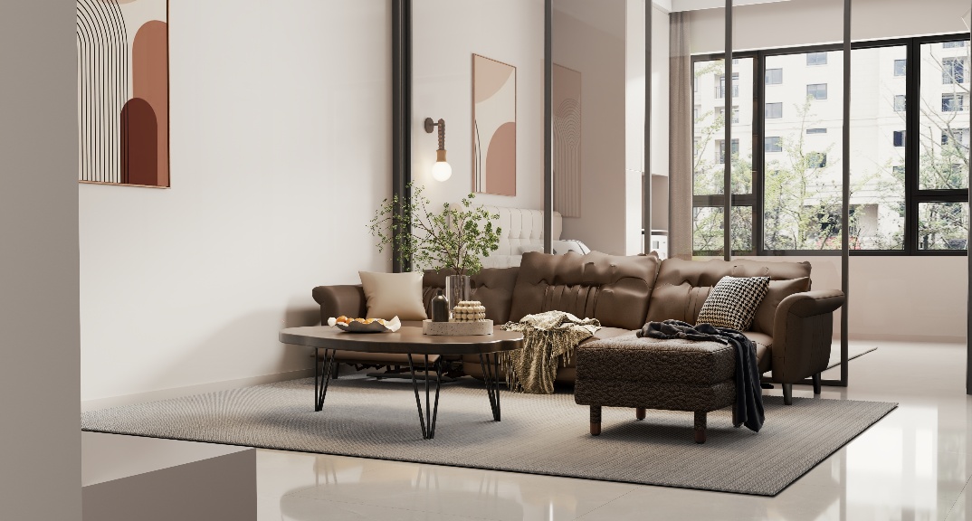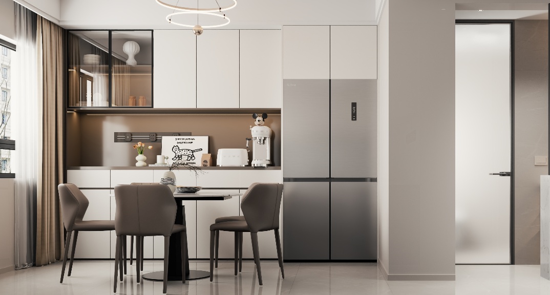 簡(jiǎn)約而不簡(jiǎn)單,瓷磚輔以暖色調(diào)并借助壁燈等光影變化來(lái)突顯這些材料優(yōu)勢(shì),令空間氛圍自然生動(dòng)。客廳采用皮質(zhì)柔軟沙發(fā)及金屬的玻璃推拉門(mén)營(yíng)造出溫馨的氛圍,推拉門(mén)也滿足了對(duì)于采光的需求。衛(wèi)生間干區(qū)用大理石收口及金屬隔斷作為銜接,讓材質(zhì)在視覺(jué)及觸覺(jué)上都極具層次感。餐廳功能性圓桌可以達(dá)到多人用餐的需求,而且離廚房近,用餐更方便。臥室用硬朗的線條、簡(jiǎn)潔的陳列、大面積的留白、溫馨的暖色床搭配壁燈設(shè)計(jì)表現(xiàn)出高級(jí)舒適的氛圍。主臥通過(guò)改造門(mén)洞位置既能滿足入戶儲(chǔ)物柜的功能,又能滿足女主衣服無(wú)處放的難題。廚房改墻把原來(lái)只能做L櫥柜變成U型,增加廚房的儲(chǔ)藏和電器空間。
