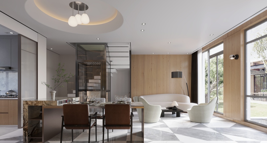 一層為開放式客餐廚空間??蛷d采用無主燈設(shè)計,搭配深色皮質(zhì)沙發(fā)和金屬質(zhì)感茶幾,營造簡約時尚的氛圍。餐廳與廚房相連,方便日常用餐和家庭聚會。