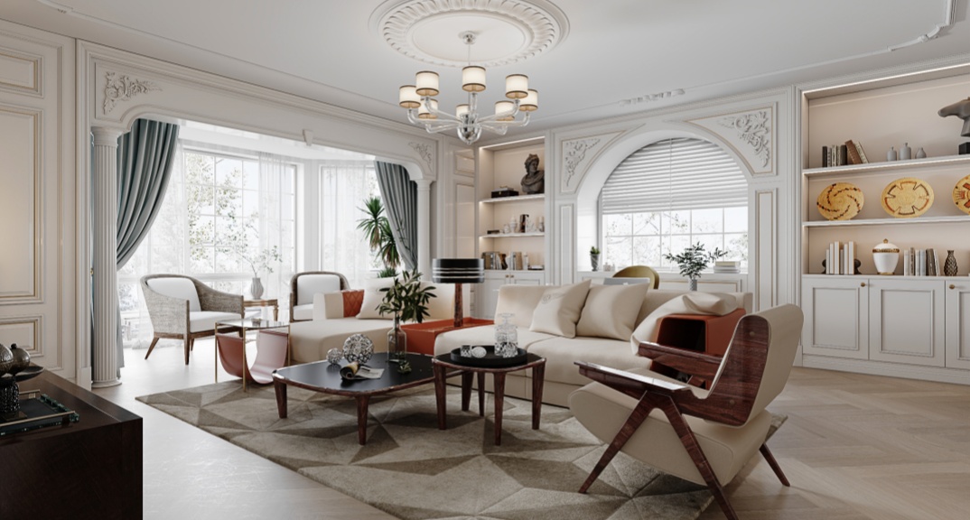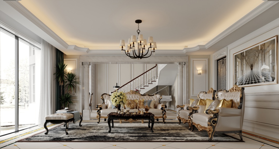 一層以會(huì)客和餐飲功能為主。挑空客廳氣勢恢宏,搭配華麗水晶燈和歐式雕花元素,彰顯尊貴氣派。餐廳與廚房相連,方便日常用餐和家庭聚會(huì)。